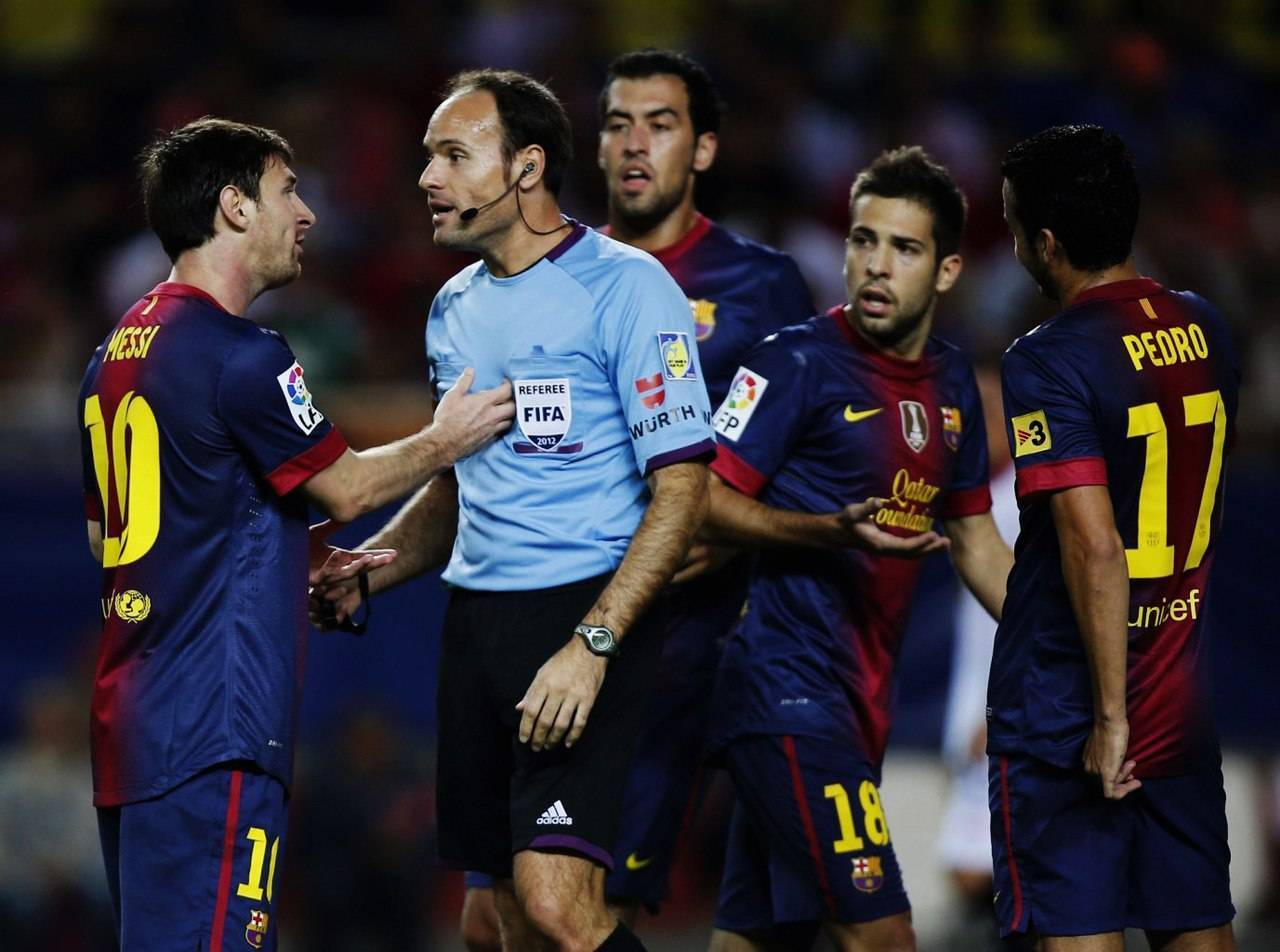 Фото 4. Антонио Матеу Лаос, футбольный арбитр спорит с игроками футбольного клуба Барселона.