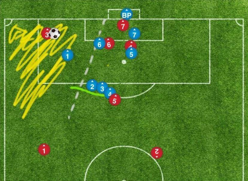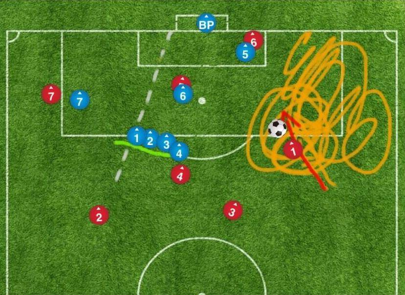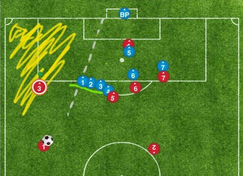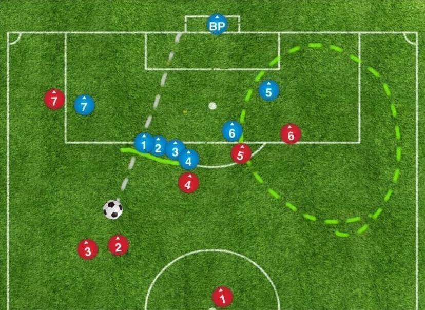 Практически всегда вратари выставляют одного защитника в стенку, чтобы не закрутили в ближний угол. И это также пришло из большого футбола. Более того, именно №1 у синих после определенных колебаний начнет смещатсья в пустую зону, обозначенную маркером. Тем не менее после получения передачи от №1 у красного игрока с №3 будет 2-3 секунды для выверенного прострела в штрафную площадь либо для самостоятельного входа в нее.