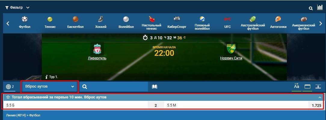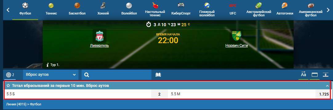 По этой причине, предлагаю рассмотреть стратегию ставок на тотал аутов. Чтобы было легче, рассмотрим интервал в 10 минут, в матче Ливерпуль — Норвич.