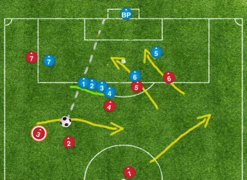Игроки «красных» под номерами 13, 12 и 15 (2 центральных защитника и опорник) обеспечивают уверенный контроль в начальной фазе атаки. Получается ситуация 3 в 1. У нападающего под №11 практически нет шансов отобрать мяч.