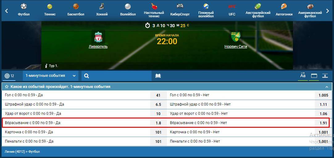 Как видите, букмекер предлагает нам выбрать, какое действие произойдет в матче в интервале 1-й минуты. Среди всех вариантов, наиболее вероятным выглядит аут, так что и на этом мы можем сыграть, используя неплохие котировки.