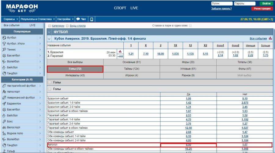 Заходим на сайт букмекера и выбираем интересующий вас матч. В моем случае я выбрал Бразилия-Парагвай. При анализе я опирался на высокую результативность бразильцев, игру на домашней арене и полную беззубость в нападении парагвайцев, что предвещает игру от обороны.