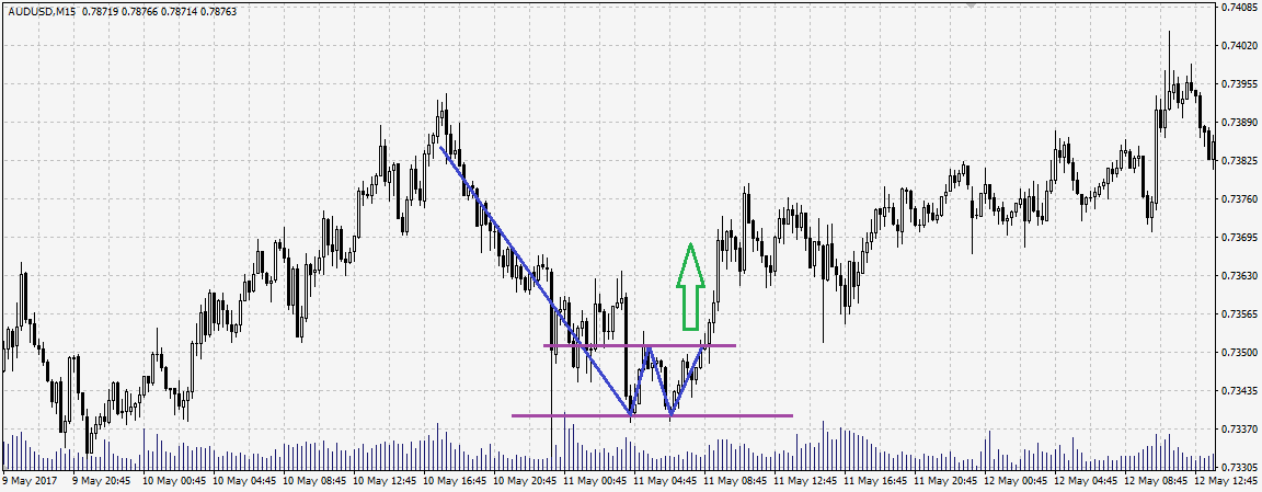 Например, фигура “Двойное дно” образуется после нисходящего тренда, когда цена, достигнув нижней точки, откатывается вверх, а затем, завершающим импульсом продаж, еще раз достигает самого дна, и снова откатывается назад. В точке первого отката образуется сопротивление, аналогичное линии шеи для “Головы и плеч”. После того, как цена второй раз достигла дна в той же точке, что и первый раз, фигура считается сформированной, и можно ожидать пробоя линии сопротивления и разворота тренда вверх.