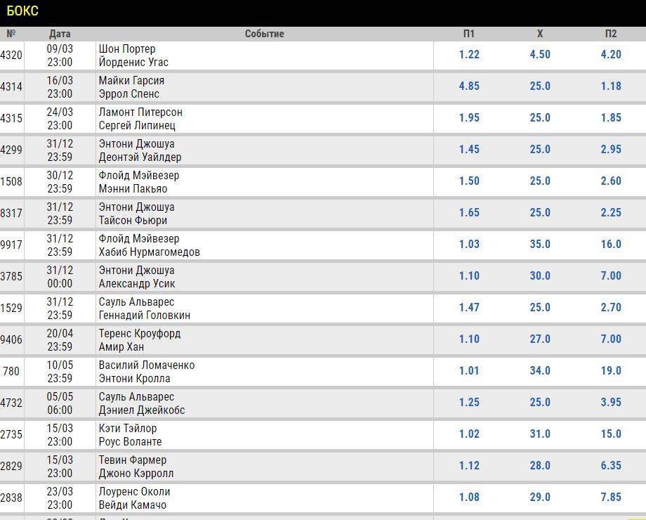 В боксерских росписях букмекеров можно найти до 50 рынков. Здесь очень многое зависит от престижности боя. Если это титульный поединок за чемпионский пояс, то линия заполнится максимальным количеством предложений. На соревнования неизвестных спортсменов роспись будет очень скромной, состоящей из максимум 10 маркетов. Среди самых востребованных вариантов ставок на бокс выделим такие:
