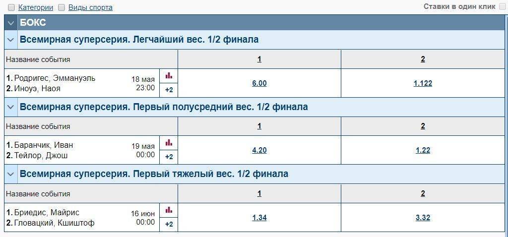 Важно: предлагаемые букмекерами коэффициенты достаточно часто разнятся (при ставка на аутсайдеров разница спокойно может доходить до 1,5). Для того чтобы регулярно делать ставки на бокс онлайн, рекомендуется иметь счета в 3-4 букмекерских конторах