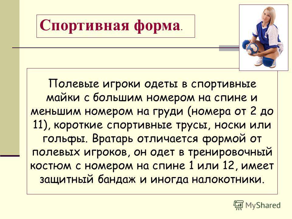 Спортивная форма. Полевые игроки одеты в спортивные майки с большим номером на спине и меньшим номером на груди (номера от 2 до 11), короткие спортивные трусы, носки или гольфы. Вратарь отличается формой от полевых игроков, он одет в тренировочный костюм с номером на спине 1 или 12, имеет защитный бандаж и иногда налокотники.