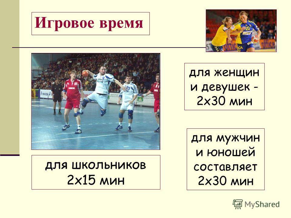 Игровое время для школьников 2×15 мин для мужчин и юношей составляет 2×30 мин для женщин и девушек – 2×30 мин
