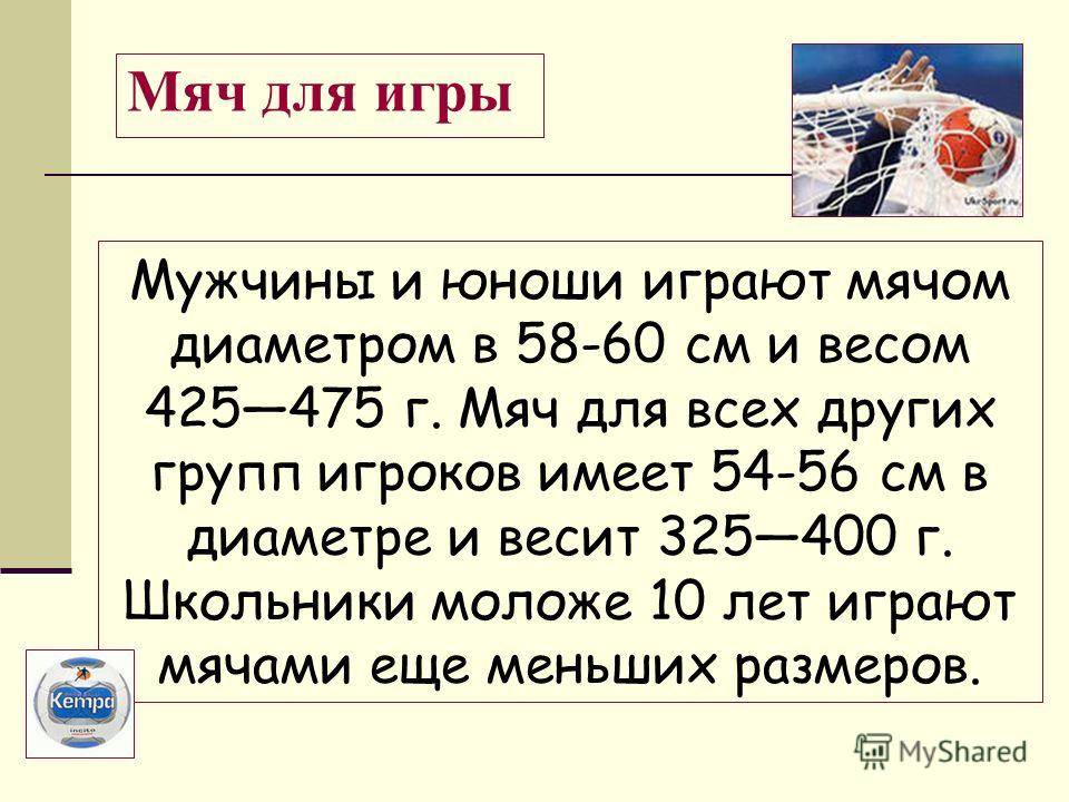 Мяч для игры Мужчины и юноши играют мячом диаметром в см и весом г. Мяч для всех других групп игроков имеет см в диаметре и весит г. Школьники моложе 10 лет играют мячами еще меньших размеров.