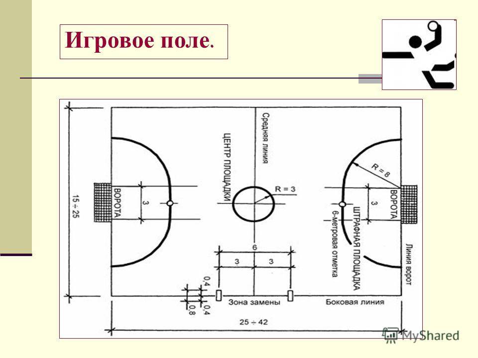 Правила игры. Команда состоит из 12 человек: 2 вратаря и 10 полевых игроков. На поле в игре находятся 1 вратарь и 6 игроков. Остальные игроки – запасные, они могут, как угодно часто заменяться. При этом заменяемый игрок должен покинуть поле прежде, чем другой вступит на него. Замена осуществляется на средней линии в пределах 4,5 – метровой зоны замены.
