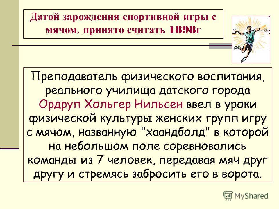 Преподаватель физического воспитания, реального училища датского города Ордруп Хольгер Нильсен ввел в уроки физической культуры женских групп игру с мячом, названную “хаандболд” в которой на небольшом поле соревновались команды из 7 человек, передавая мяч друг другу и стремясь забросить его в ворота. Датой зарождения спортивной игры с мячом, принято считать 1898 г