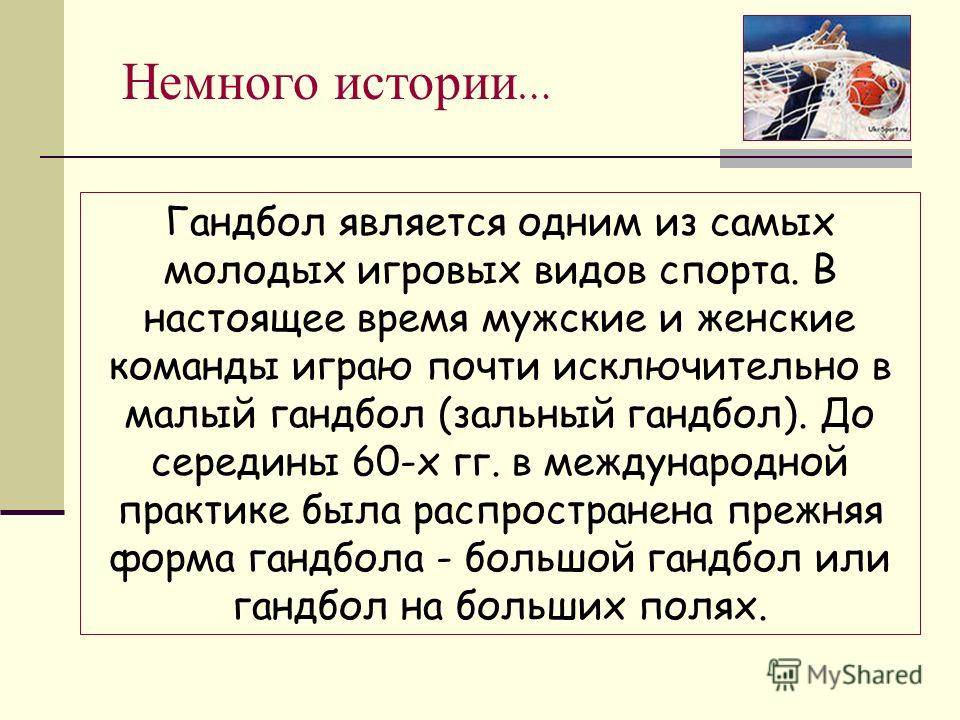 Гандбол является одним из самых молодых игровых видов спорта. В настоящее время мужские и женские команды играю почти исключительно в малый гандбол (зальный гандбол). До середины 60-х гг. в международной практике была распространена прежняя форма гандбола – большой гандбол или гандбол на больших полях. Немного истории …