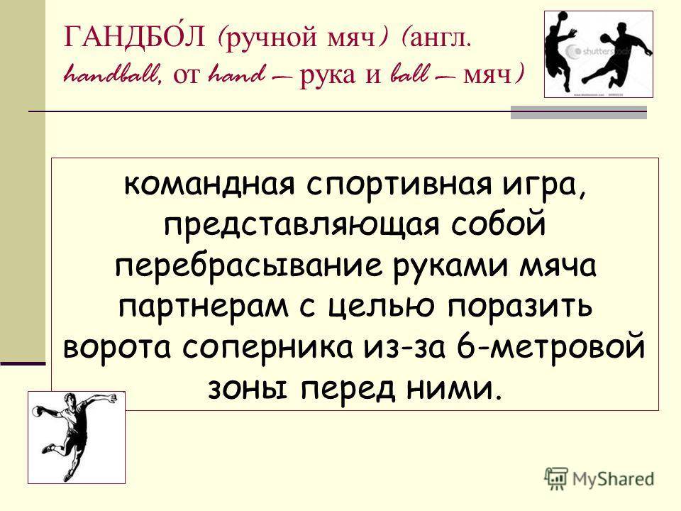 командная спортивная игра, представляющая собой перебрасывание руками мяча партнерам с целью поразить ворота соперника из-за 6-метровой зоны перед ними. ГАНДБО́Л ( ручной мяч ) ( англ. handball, от hand рука и ball мяч )