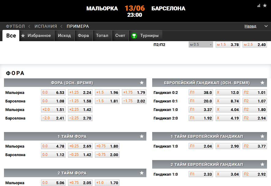 В БК такая ставка обозначается как счет в скобках, с которого как бы начинается матч. Например, на поединок чемпионата Испании по футболу Мальорка – Барселона при гандикапе (2:0) коэффициент на победу Мальорки 1,92, на ничью – 4,19, на успех Барселоны – 2,94. Если ставить на каталонцев, то получите деньги в случае их победы с преимуществом минимум в три мяча. Если на Мальорку, то при их выигрыше, равном счете или фиаско с разницей в один мяч.