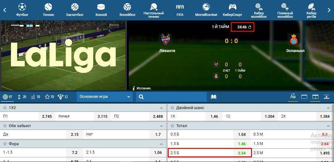 Покажу, как это работает на примере матча Леванте — Эспаньол. Как видите, к 25 минуте, на табло горят нули, и мы можем поставить на ТБ2.5 с кэфом 2.5.
