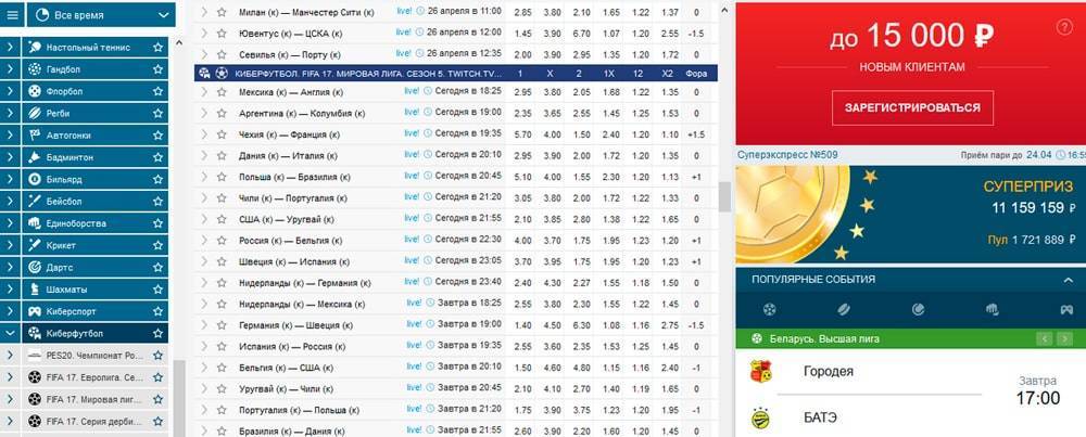 - доступные виды ставок: исход, фора, чет/нечет, тотал, двойной шанс;