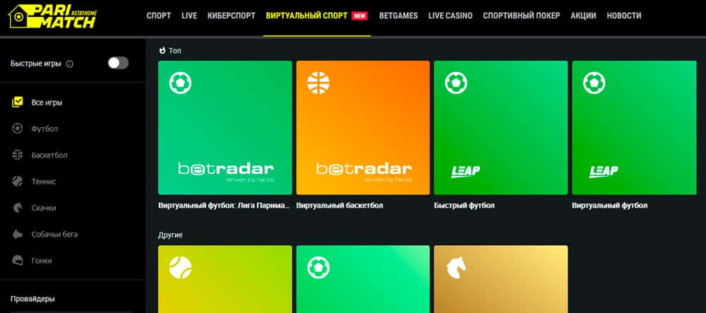 У международного Parimatch есть отдельный раздел «Виртуальный футбол», куда и помещены разновидности Virtual Football.