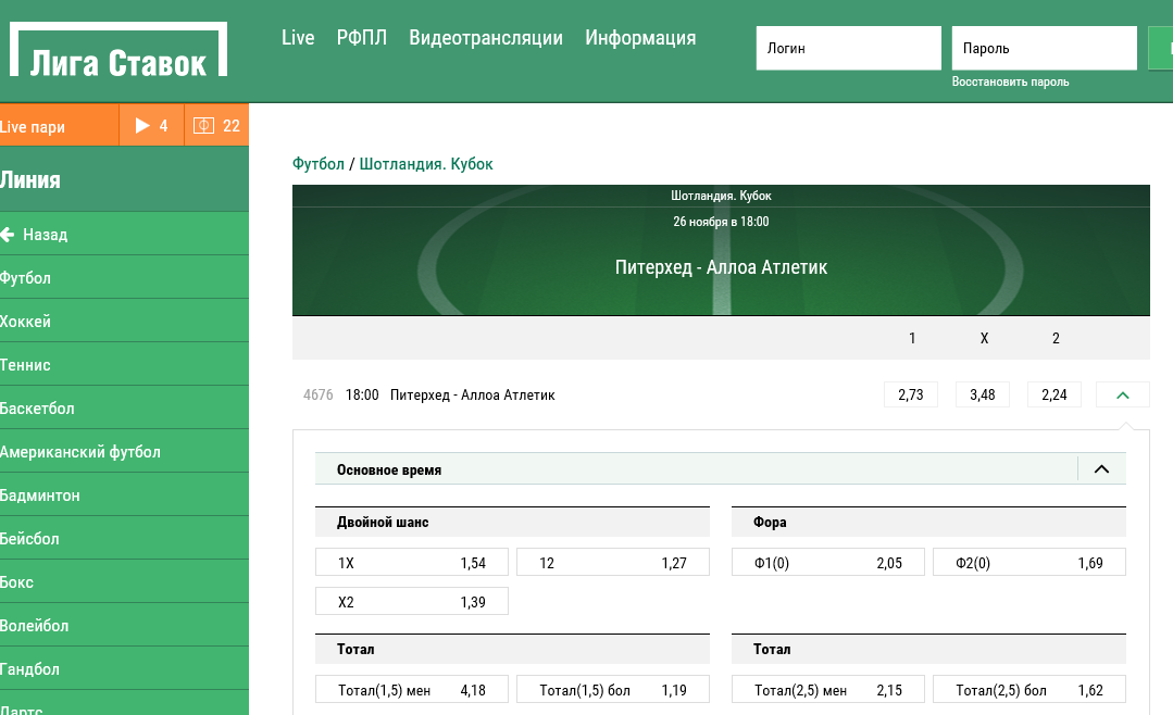 В букмекерской конторе можно поставить не только на исход матча, но и на нарушения, удаления, угловые, центр. Для примера возьмем Кубок Шотландии и матч «Питерхед — Аллоа Атлетик». Конечно, по форам коэффициенты чуть ниже, чем при ставках на основной исход. Но и вероятность НЕ ПРОИГРАТЬ выше. Само собой, на сайте букмекерской конторы вы можете подобрать подходящие вам матчи из российской Премьер-лиги, что-нибудь из французов, немцев и так далее. Также есть возможность поставить на исход в теннисных состязаниях.