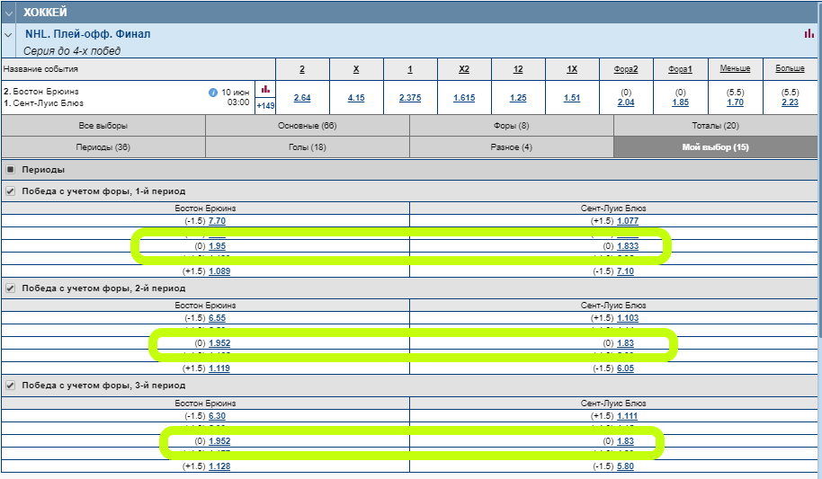 Возьмем пример предстоящего матча в Кубке Стэнли 2019 между Сент-Луисом и Бостоном. Как видно, в прематче коэффициенты на фору 0 в периодах заложены высокие. В лайве они могут упасть или сдвинуться в сторону одной из команд (в плюс или минус), по ситуации. Главное только играть на одной команде. И точка.