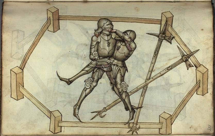 Несмотря на такое отношение со стороны церкви, борьбой увлекались не только крестьяне и горожане, но и воинское сословие, особенно когда доспехи стали слишком массивными. Пробить их мечом или копьем становилось трудной задачей, а вот бросить противника на землю и заколоть кинжалом в забрало, а может даже взять в плен и получить выкуп — милое дело.