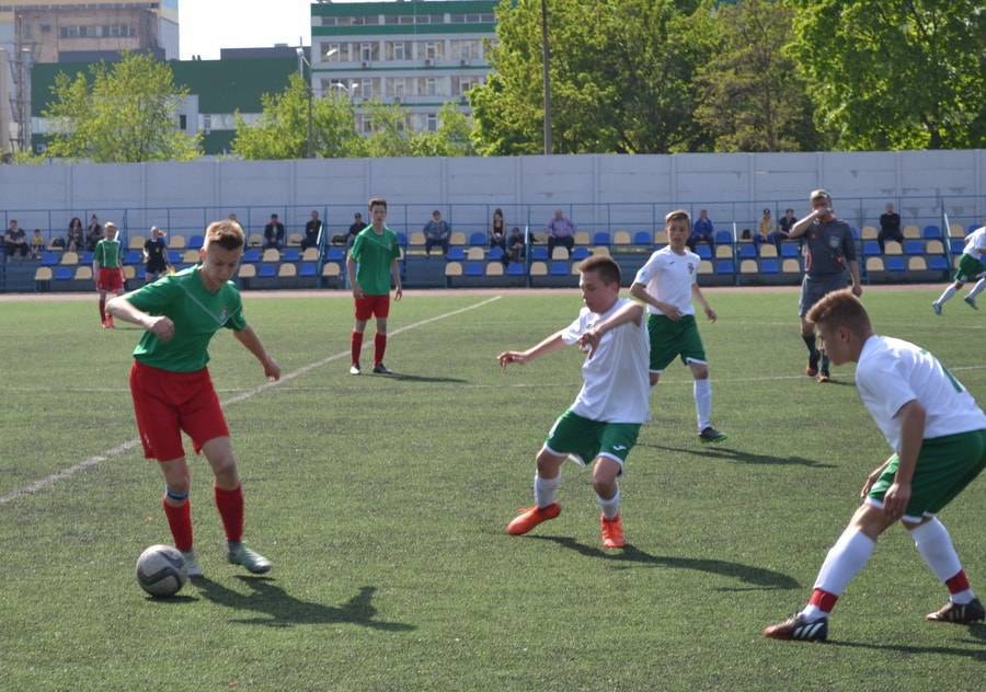 Опорный полузащитник Локомотива U-14 Артем Хацкевич в борьбе с игроками киевской Смены