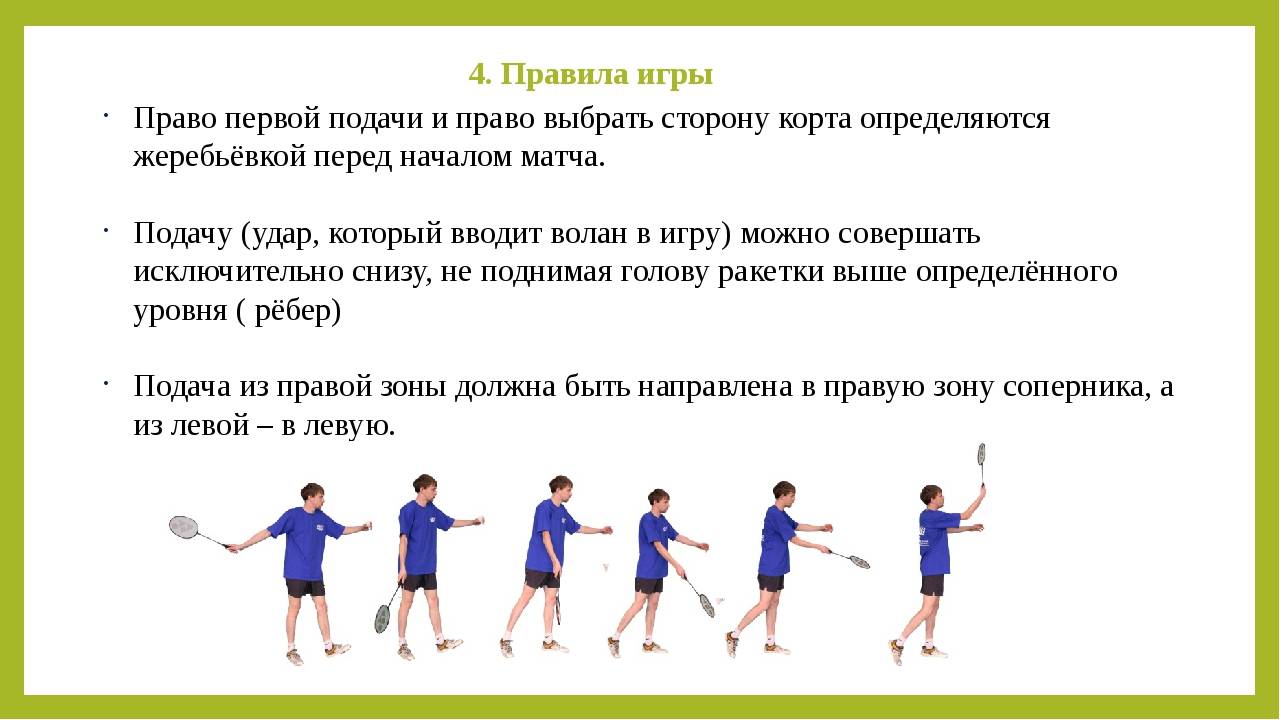 Перед началом игры проводится жеребьевка, которая определяет стороны и право первой подачи. Правила подачи в бадминтоне: удар по волану должен приходиться снизу и ракетка не должна подниматься выше пояса подающего. Допускается использование обманных/ложных действий при подаче. После подачи игроки в праве свободно передвигаться по своей площадке, но касания сетки строго запрещены.