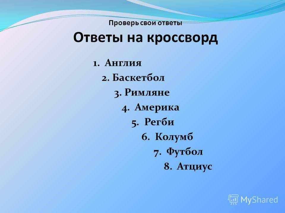 Проверь свои ответы Ответы на кроссворд 1. Англия 2. Баскетбол 3. Римляне 4. Америка 5. Регби 6. Колумб 7. Футбол 8. Атциус