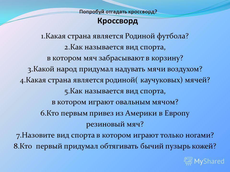 Попробуй отгадать кроссворд? Кроссворд 1.Какая страна является Родиной футбола? 2.Как называется вид спорта, в котором мяч забрасывают в корзину? 3.Какой народ придумал надувать мячи воздухом? 4.Какая страна является родиной( каучуковых) мячей? 5.Как называется вид спорта, в котором играют овальным мячом? 6.Кто первым привез из Америки в Европу резиновый мяч? 7.Назовите вид спорта в котором играют только ногами? 8.Кто первый придумал обтягивать бычий пузырь кожей?