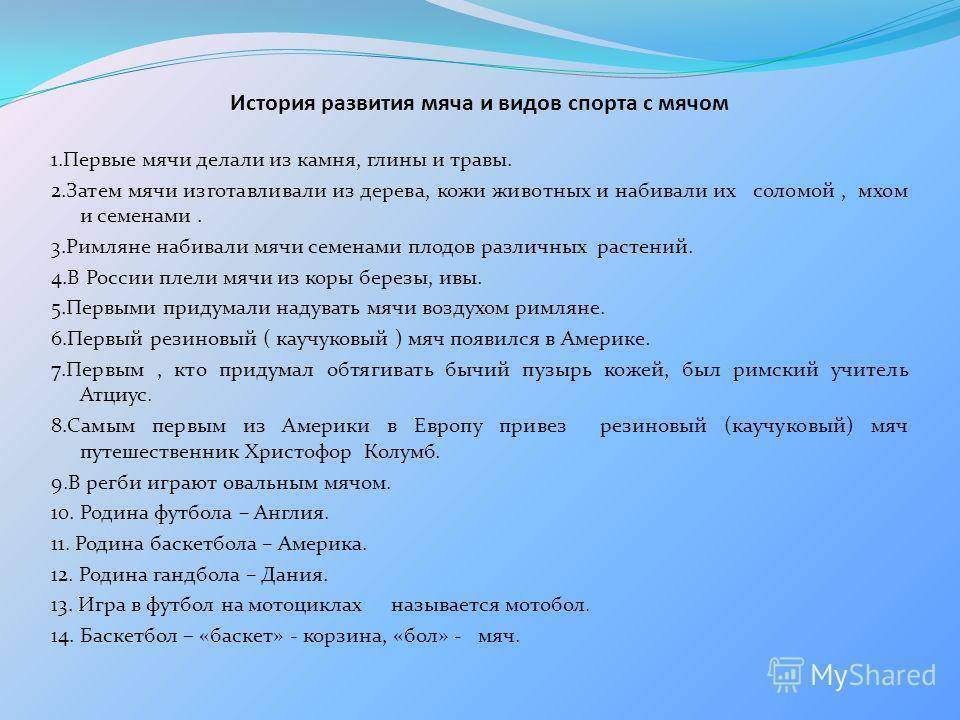 История развития мяча и видов спорта с мячом 1.Первые мячи делали из камня, глины и травы. 2.Затем мячи изготавливали из дерева, кожи животных и набивали их соломой, мхом и семенами. 3.Римляне набивали мячи семенами плодов различных растений. 4.В России плели мячи из коры березы, ивы. 5.Первыми придумали надувать мячи воздухом римляне. 6.Первый резиновый ( каучуковый ) мяч появился в Америке. 7.Первым, кто придумал обтягивать бычий пузырь кожей, был римский учитель Атциус. 8.Самым первым из Америки в Европу привез резиновый (каучуковый) мяч путешественник Христофор Колумб. 9.В регби играют овальным мячом. 10. Родина футбола – Англия. 11. Родина баскетбола – Америка. 12. Родина гандбола – Дания. 13. Игра в футбол на мотоциклах называется мотобол. 14. Баскетбол – «баскет» – корзина, «бол» – мяч.