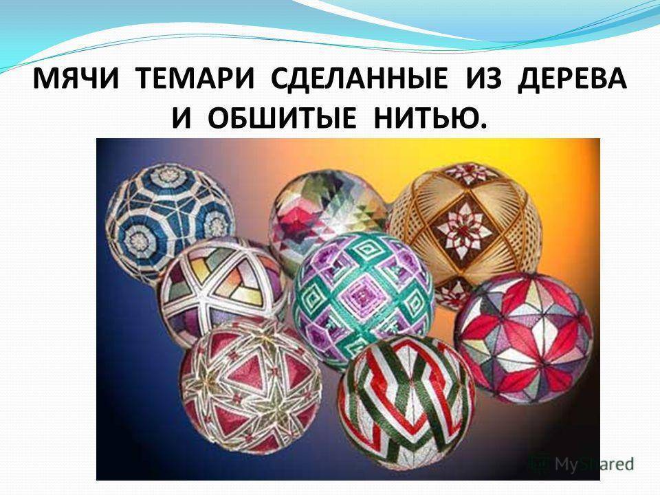 МЯЧИ ТЕМАРИ СДЕЛАННЫЕ ИЗ ДЕРЕВА И ОБШИТЫЕ НИТЬЮ.