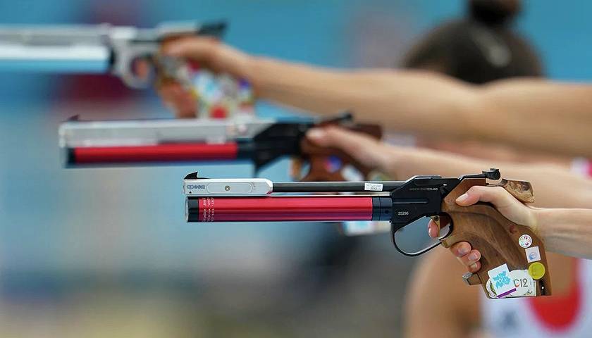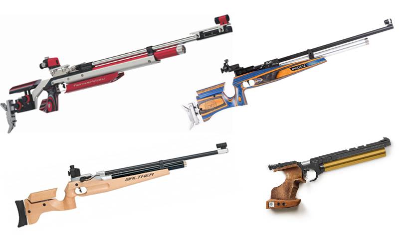 Пистолеты применяются тех же типов, что и винтовки. Самые мощные имеют калибр от 7,62 до 9,65 мм. При стрельбе используется только одно положение — стоя, с оружием в вытянутой руке. Дистанция варьирует от 10 до 50 м.