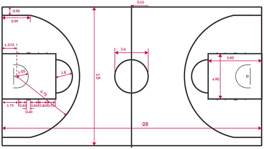Баскетбольная корзина состоит из кольца и прикрепленной к нему сетки диной 40-45 см. Диаметр кольца – 45-45,7 см. Оно должно быть оранжевого цвета. Прикрепляется к щиту на высоте 3,05 метра, но не вплотную, а в 15 см от него.