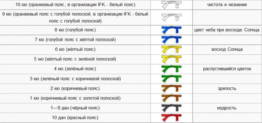 10 КЮ — оранжевый пояс, в организации IKF — белый пояс