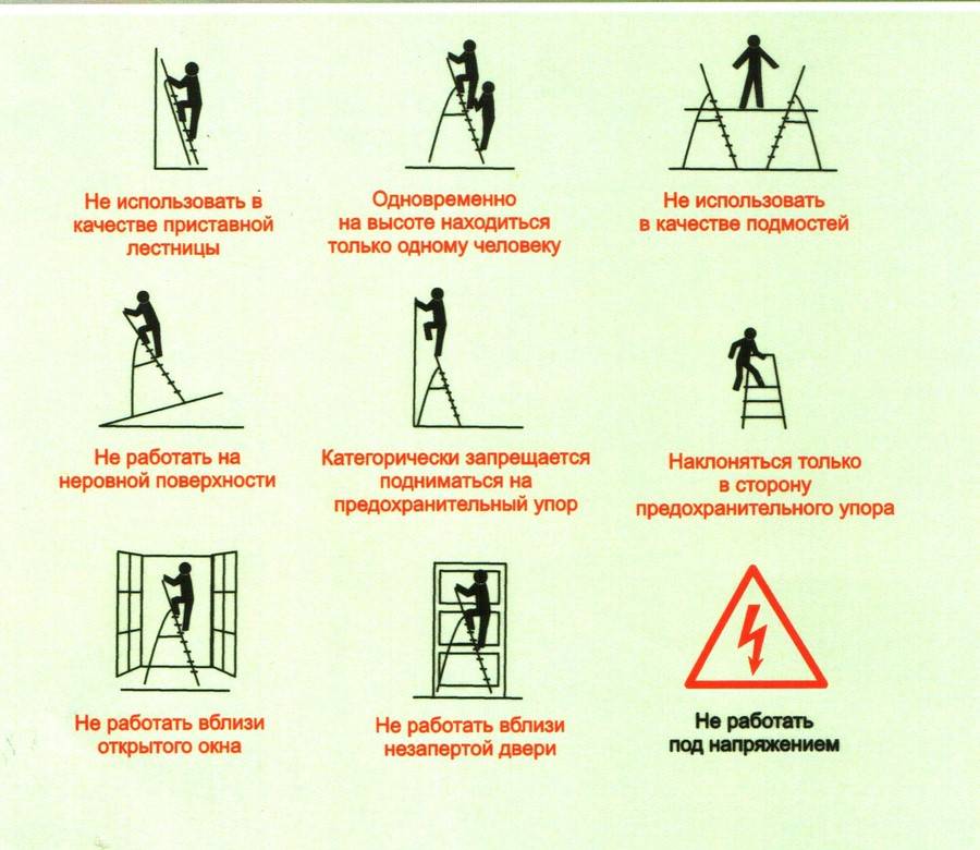 - по технике безопасности в работе на стремянке и лестнице не допустимо: стоять на уровне, превышающем 1 метр от края конструкции; если нет перил либо специального заграждения находиться на верхних ступенях; нахождение более одного работника на ступенях; применение металлических изделий при манипуляциях, связанных с электричеством;