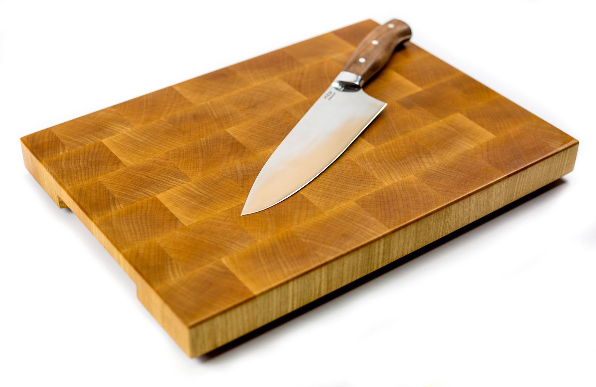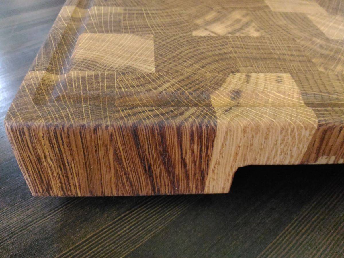 - Когда лезвие касается поверхности торцевой доски, оно раздвигает волокна, а не перерезает их. Кромка кухонного прибора дольше сохраняет свои режущие свойства, необходимость в заточке возникает реже. Поэтому профессиональные повара предпочитают торцевые доски, это экономит им время.