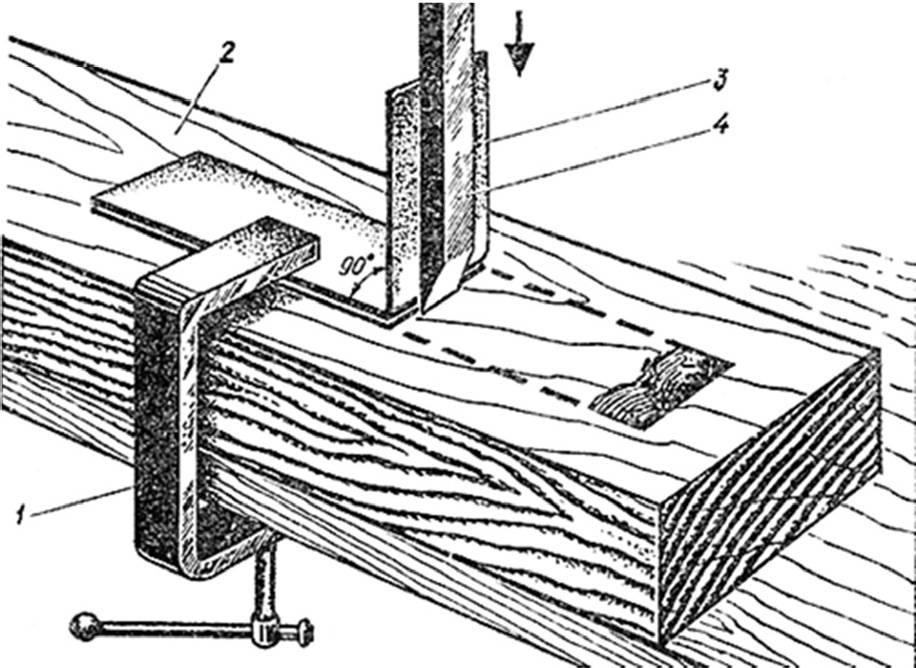 Рис. 12. Использование упора при долблении: 1 – струбцина; 2 – деталь; 3 – металлический упор; 4 – долото
