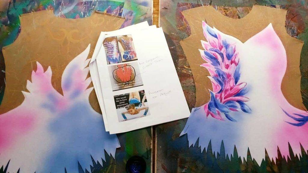 Основываясь на информации от наших клиентов, команда дизайнеров собирается и обсуждает все опции. В некоторых случаях у нас уже есть пошитые костюмы/платья. Однако, если они не подходят, дизайнер должен нарисовать эскиз для нового изделия на основе требований нашего клиента. Конечно же очень много времени уходит на размышления и обработку предоставленной информации, прослушивание музыки для выступления, консультации с командой до того момента как дизайнер начнет рисовать эскиз. Мы никогда не начинаем шить платье для фигурного катания без своевременной подготовки.
