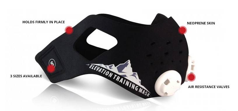 Эта кислородная маска для бега, является самой первой в линейке тренировочных масок «elevation training mask». Представляет из себя резиновый противогаз. Но вместо фильтра (банки) имеет три насадки, с различным количеством отверстий (1,2 и 3). Меняя эти насадки, можно регулировать доступ воздуха.