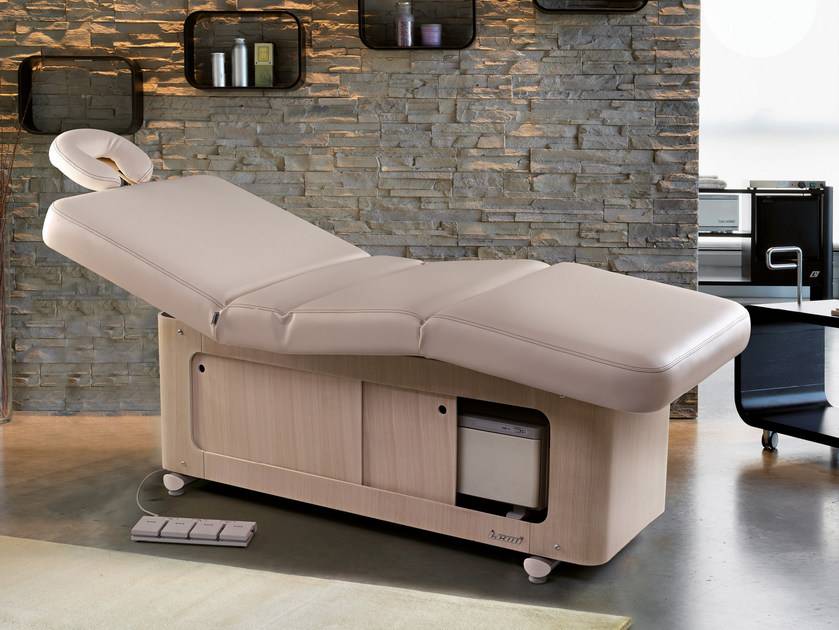 Стационарный массажный стол. Довольно массивная и тяжелая конструкция, очень устойчивая, однако совершенно не подходит для транспортировки. Обычно их покупают для установки в спа-салонах, клиниках и салонах красоты — предполагается, что такой стол как минимум несколько лет не потребуется сдвигать с места, разве что заведение решит переехать в новое помещение. Стационарные массажные столы исключительно комфортны, многие из них могут трансформироваться. Как правило, такие модели используются не только как массажный стол, но и как кресло для спа-процедур и косметологических манипуляций.