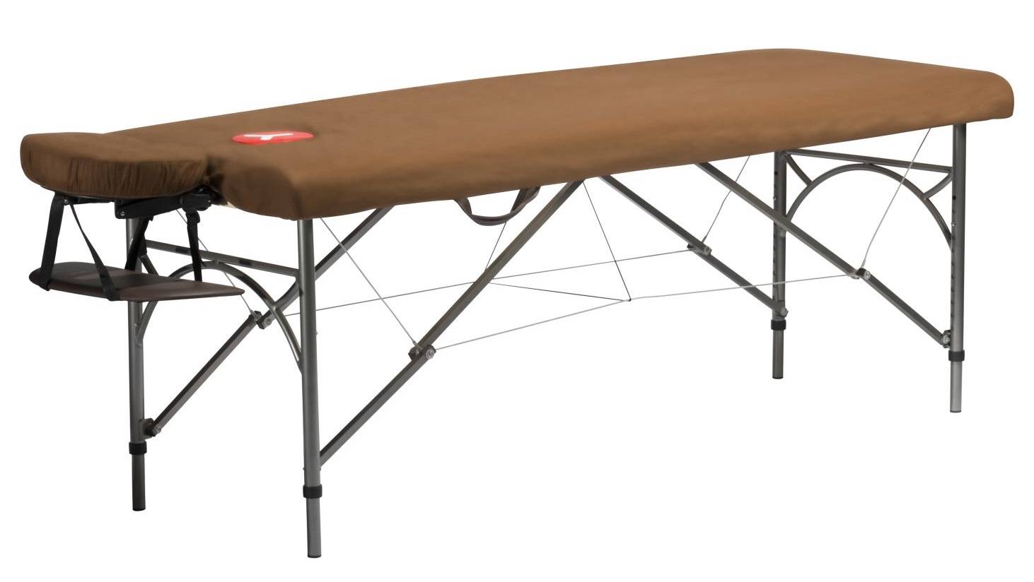 В качестве наполнителя здесь используется пена Hard-Foam. Она сохраняет форму в течение длительного времени и отличается износостойкостью. Основа выполнена из алюминия, не боится большой нагрузки и воздействия коррозии. В комплект входит специальная сумка для транспортировки. Размеры ложа 70х192 см, общая масса стола — 20 килограммов. Здесь есть вырез для лица, подголовник, полки для рук и подлокотники. Высоту кушетки можно быстро отрегулировать.