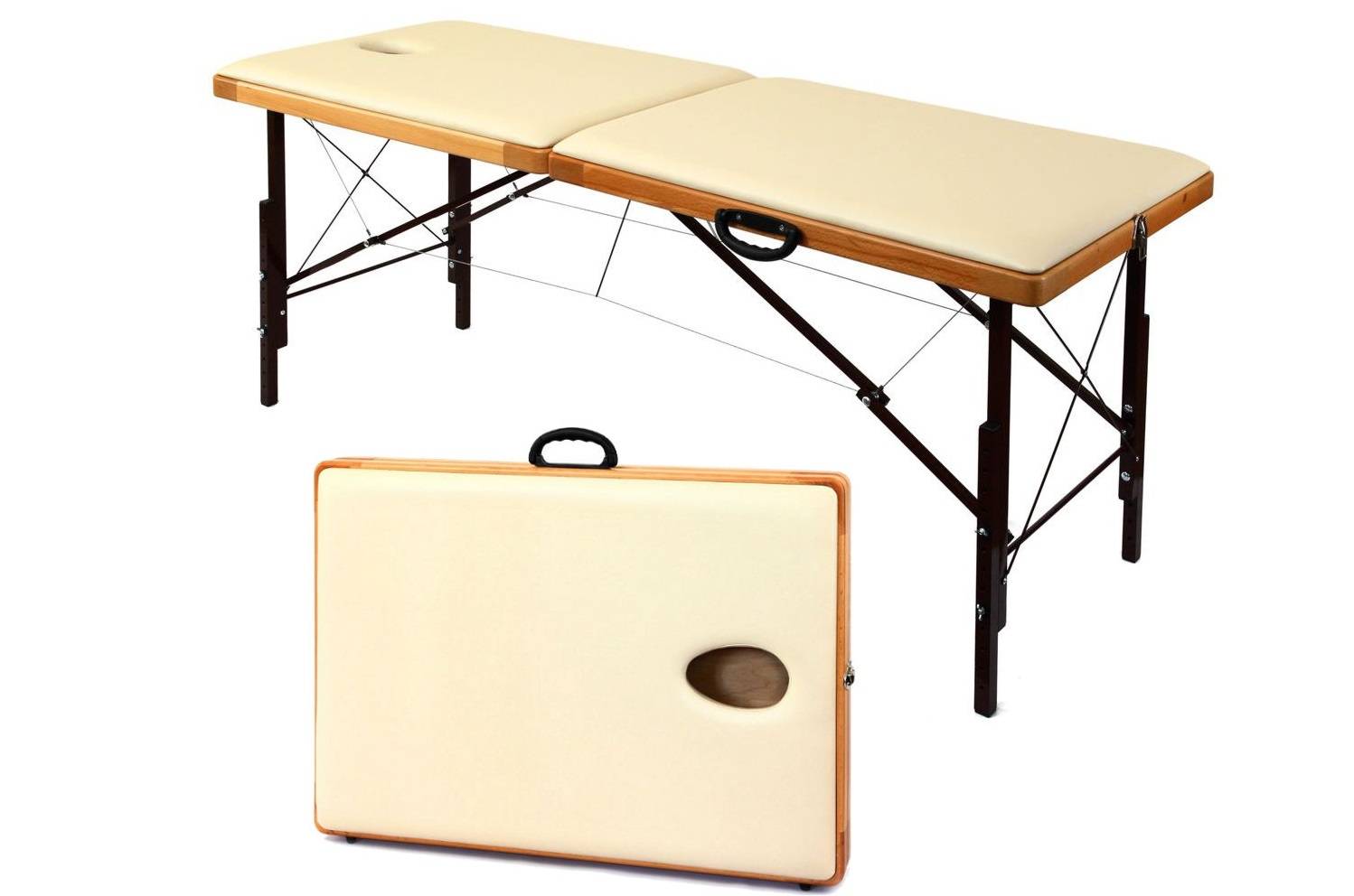 Портативный трехсекционный стол для массажных, косметических и медицинских процедур. Имеет буковый каркас, подъемную секцию в головной части. Сеансы можно проводить в положении лежа, сидя, полусидя – всего 9 вариантов. Градус подъема меняется до 75. Важным преимуществом является боковая рама арочного вида – это дает возможность специалисту присесть при необходимости рядом с клиентом. Покупатели отмечают легкость складывания, раскладывания стола, что облегчает его эксплуатацию. Сумка-чехол в комплекте обеспечивает удобство при транспортировке. Максимальная нагрузка при работе – 200 кг. Вес кушетки 17 кг. Длина с подголовником 2,1 м. Регулировка по высоте в пределах от 65 до 88 см – это помогает выставлять параметры с учетом роста массажиста.