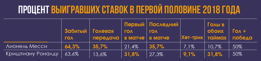 - Ставки на голы Месси выигрывали на 3,6% чаще, чем на голы Роналду
