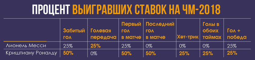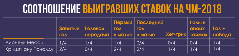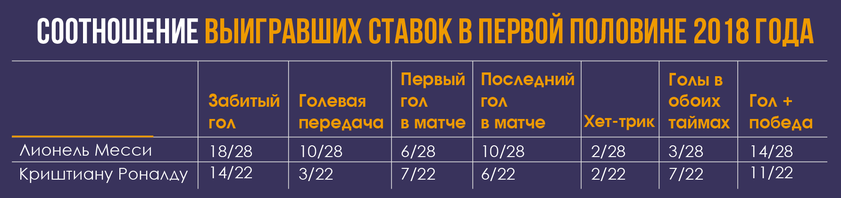 Более понятное для восприятия процентное соотношение выигрышных ставок демонстрирует равенство между игроками: Роналду и Месси записали в свой актив по 3 категории каждый. В одном компоненте выявить сильнейшего не удалось.