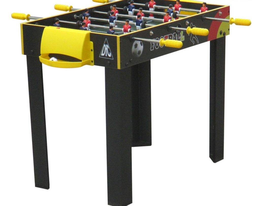Стол с игровым полем станет дополнением любой детской комнаты. Внешне имеет компактные размеры и вес, всего 11 кг. Модель подходит для детей возрастом от 5 лет. Удобные ручки двигаются легко и позволяют вести активную игру. Предусмотрено изделие для двух игроков. Можно приобрести стол коричневого или желтого цвета. Все детали изготовлены из пластика, однако как отмечают пользователи, это не снижает длительности эксплуатации изделия.