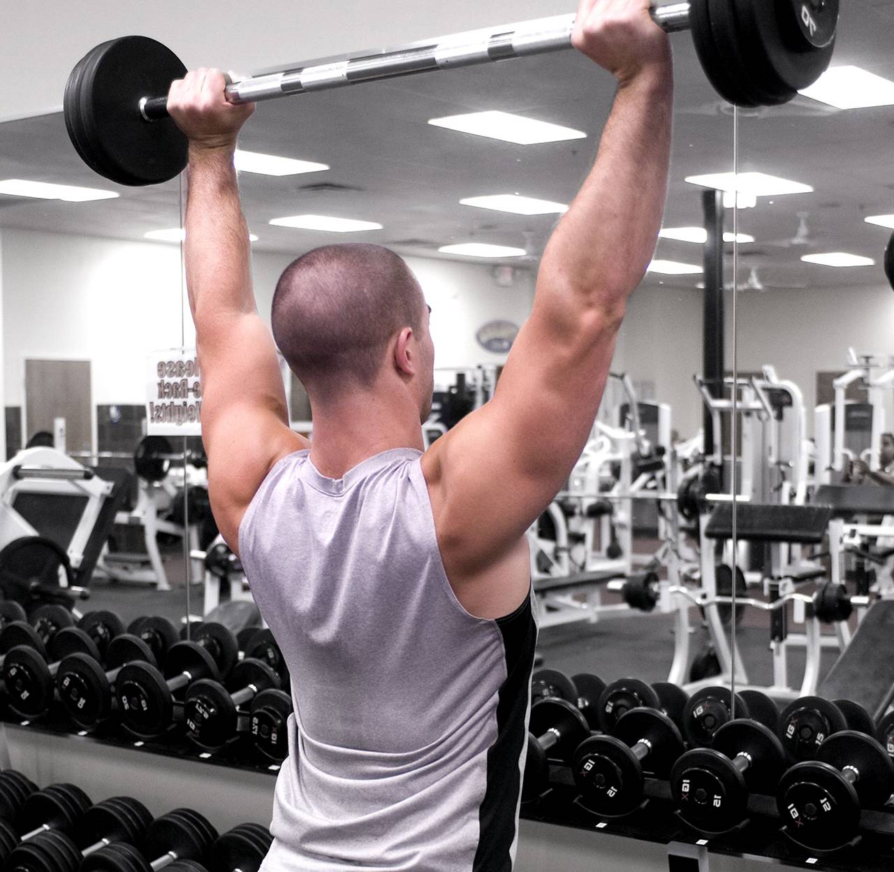 - для трицепсов, дельт и множества других мышц (базовое упражнение) — жим штанги сидя или стоя;