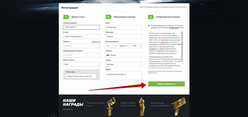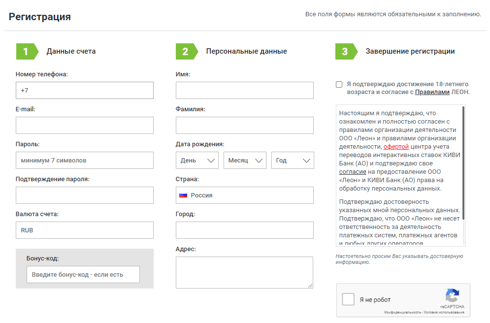 Перейдите на сайт легальной российской БК «Леон» и нажмите кнопку «Регистрация». В открывшемся окне нужно указать следующие данные: