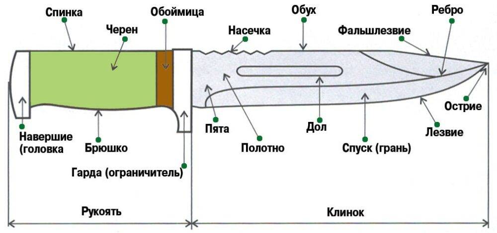 - Рукоять ножа должна быть из материала с хорошими фрикционными свойствами и обязательно оснащена гардой.