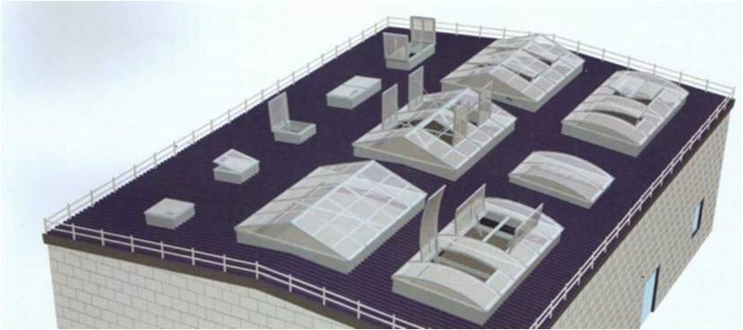 - решается проблема дымоудаления через систему люков и подключения их посредством электроприводов к пожарной сигнализации;