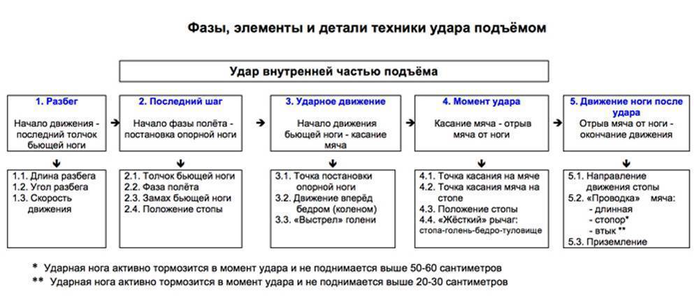 Биомеханическая составляющая этой группы ударов важна, потому что от массы тела вовлеченной в движение, рычагов, углов действия различных суставов, в конечном счете, зависит, на сколько удар, будет сильным или точным. Конечно, каждый вид ударов в футболе имеет свои особенности.