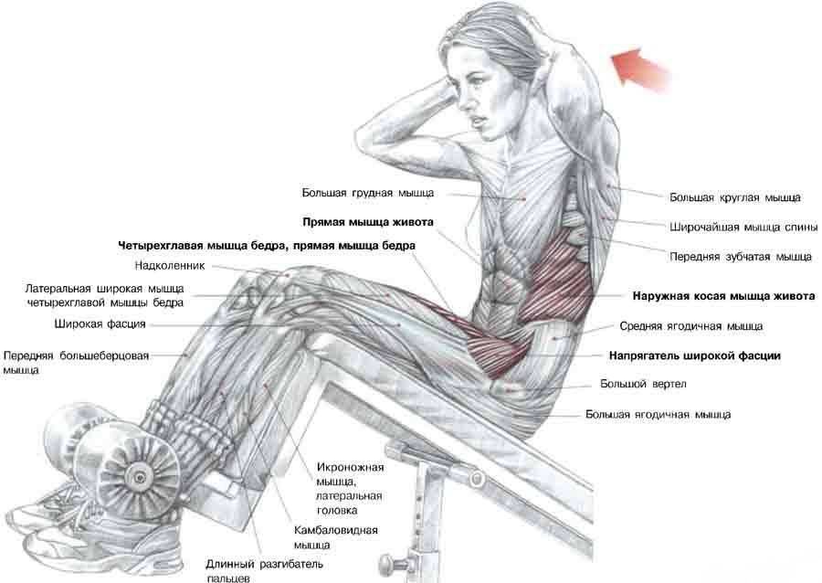Простое и давно знакомое упражнение отлично прорабатывает пресс на наклонной скамье. Во время выполнения задействован нижний мышечный отдел, передняя часть бедренных мышц, мускулатура нижней части спины. Выполняется в 3-4 подхода по 10-15 повторений: