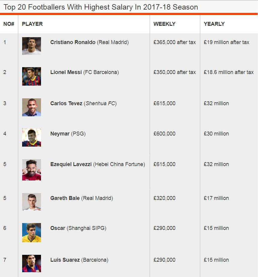 Рейтинг самых высоких зарплат футболистов в мире 2018